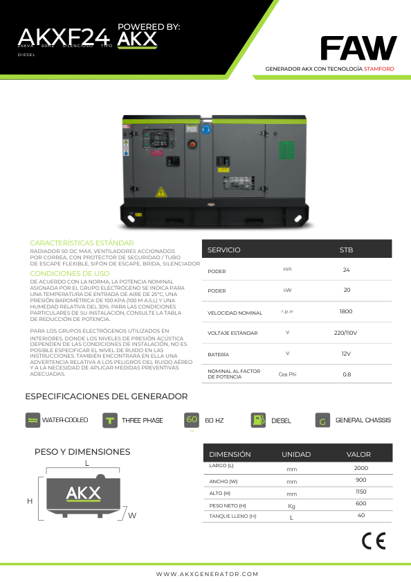 Características Técnicas y Especificaciones del Generador 24KVA FAW