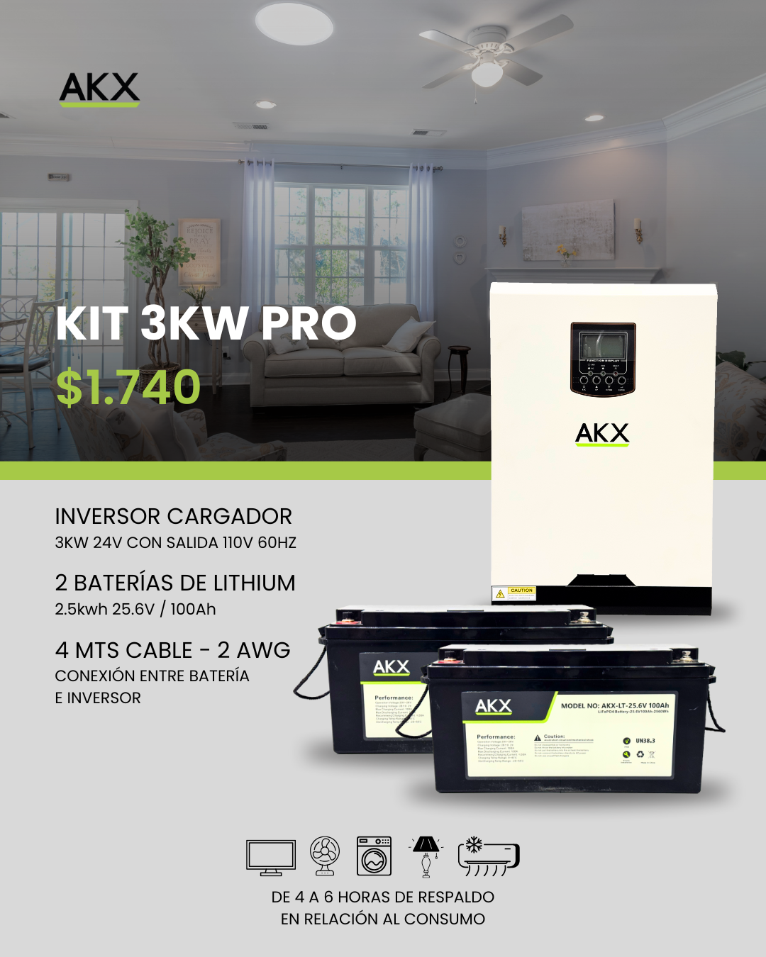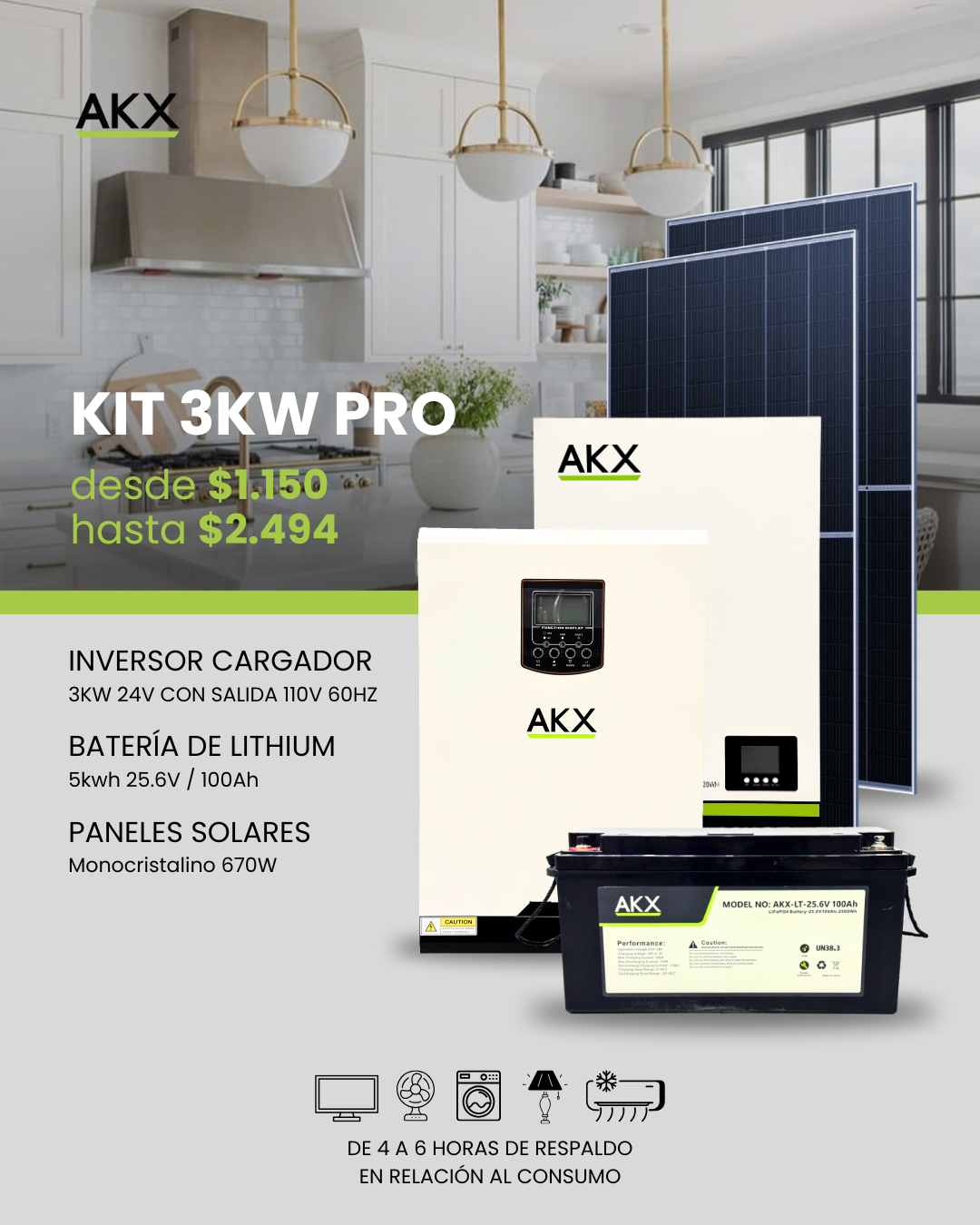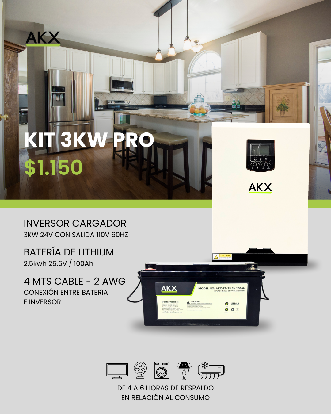- Kit 1: Incluye 1 Inversor 3KW Pro + 1 batería de litio de 2.5KW 25,6V/100Ah, ideal para hogares con alto consumo energético.