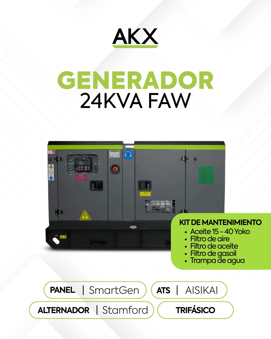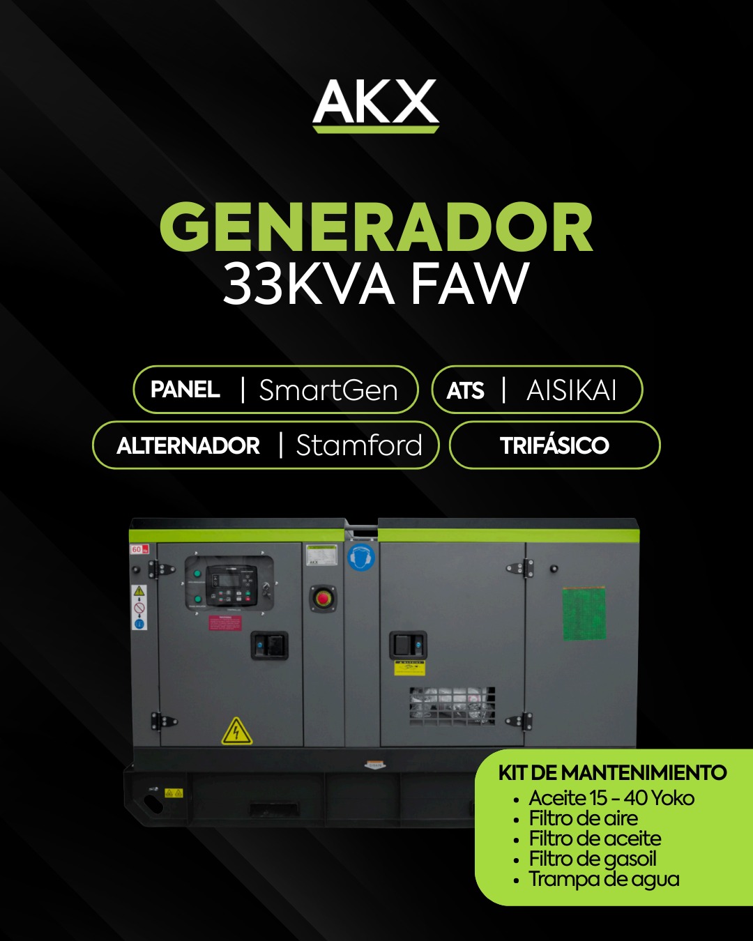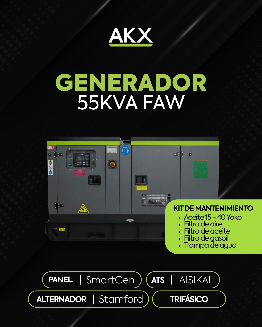 El Kit de mantenimiento es fundamental para mantener tu generador siempre en óptimas condiciones. Protege tu inversión, evita fallos costosos y asegura un rendimiento constante. Con un mantenimiento preventivo adecuado, tu generador FAW, ya sea trifásico de 24kVA, 33kVA o 55kVA, estará listo para suministrar energía confiable justo cuando la necesites.