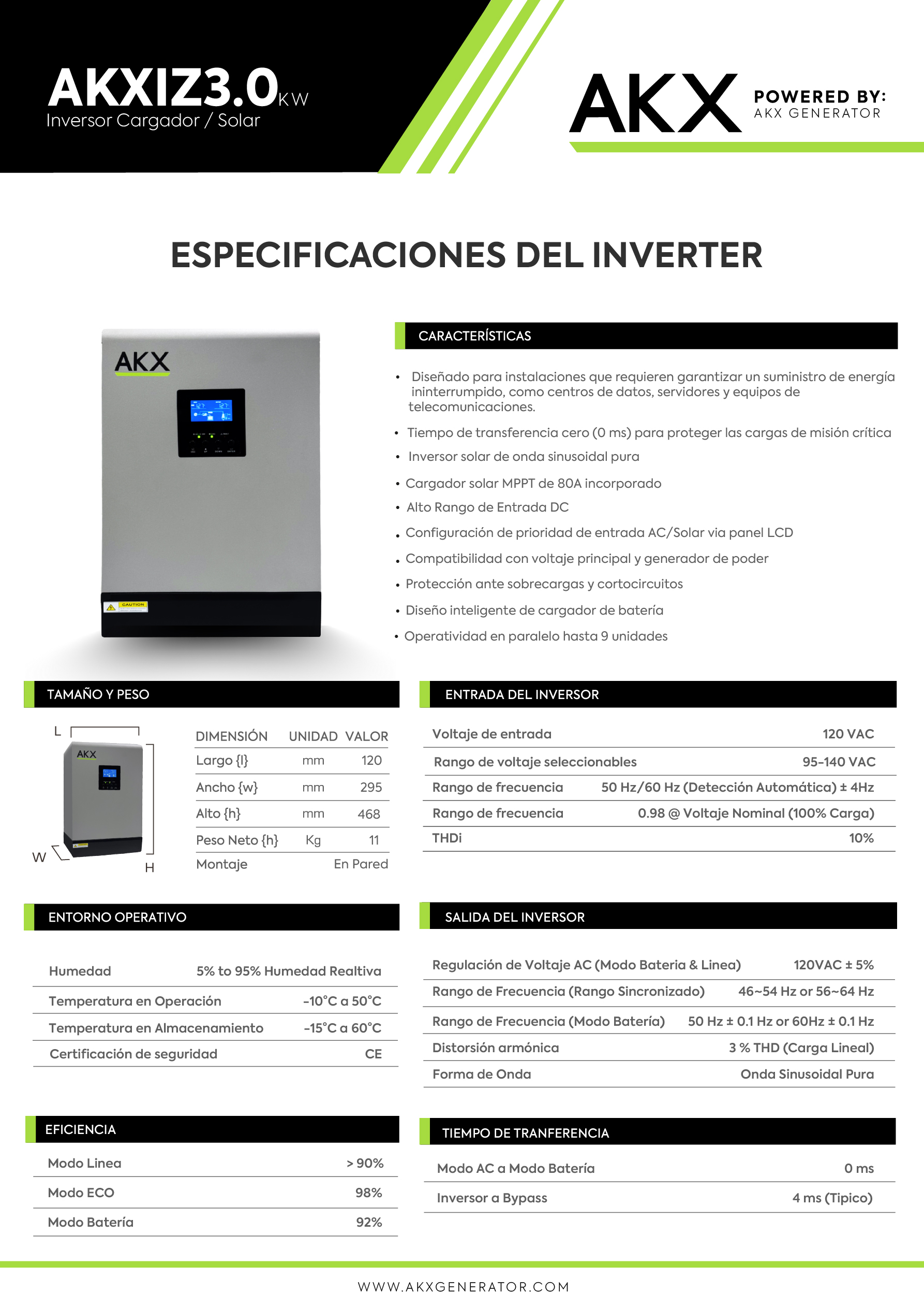 El tiempo de transferencia es el lapso entre que se interrumpe el suministro eléctrico y el inversor comienza a proveer energía. En la mayoría de los inversores convencionales, este proceso puede tardar entre 8 y 20 milisegundos. Sin embargo, en equipos como servidores o sistemas médicos, ese intervalo puede ser fatal. El Inversor AKX ZERO, al ofrecer 0 ms, asegura que no exista ningún «parpadeo» eléctrico, evitando así apagones inesperados.